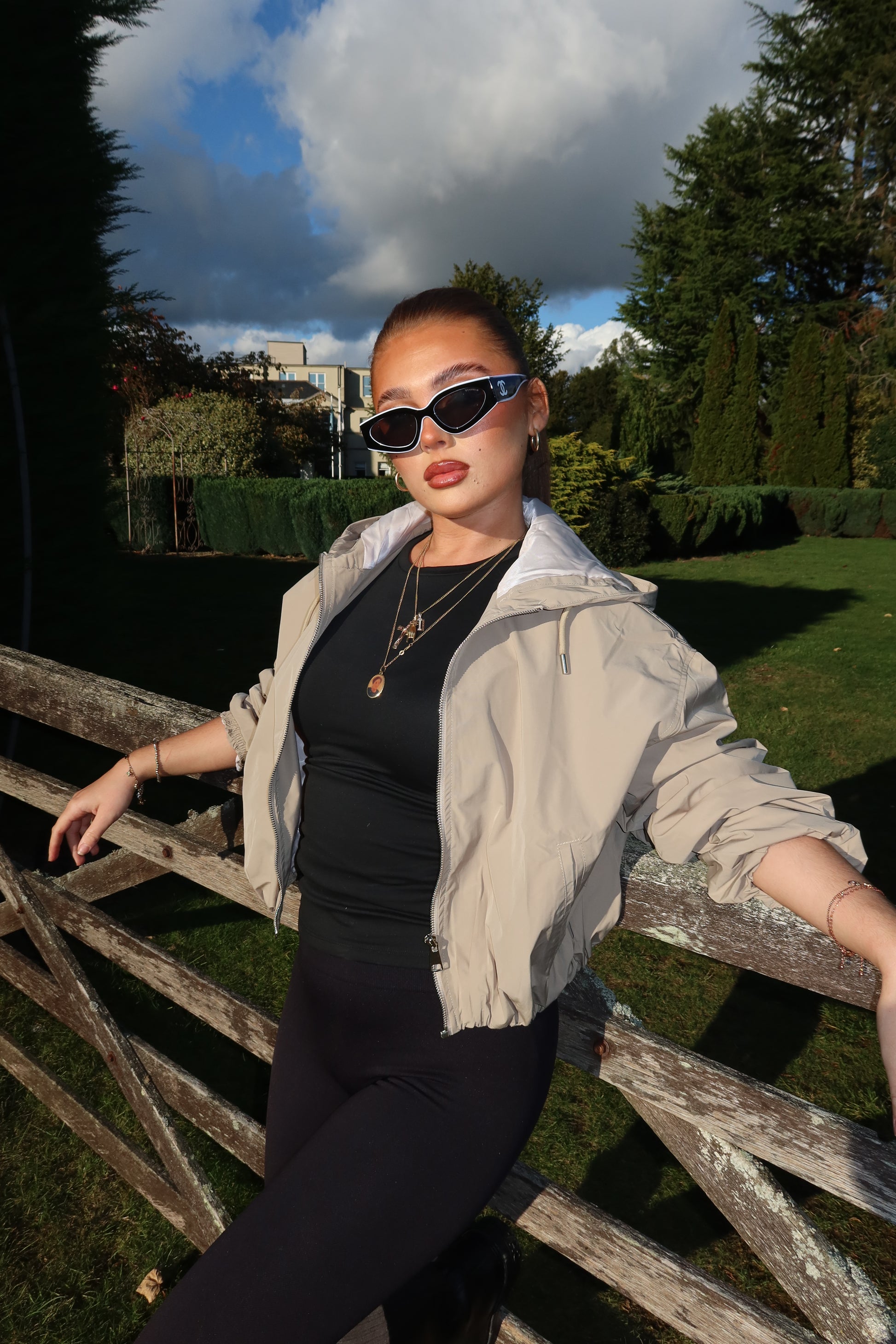 The beige cropped zip up hood jacket
